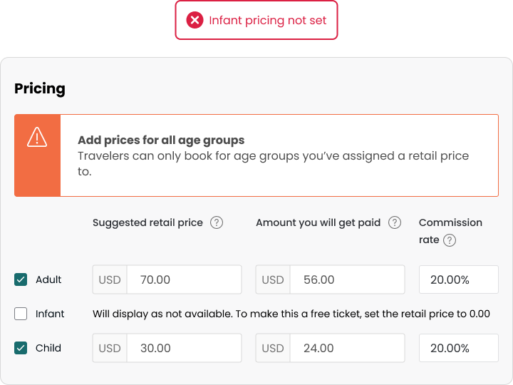 Add pricing for all age groups, including any that are missing. Enter $0 if infants are free, or enter your standard rate for infants.